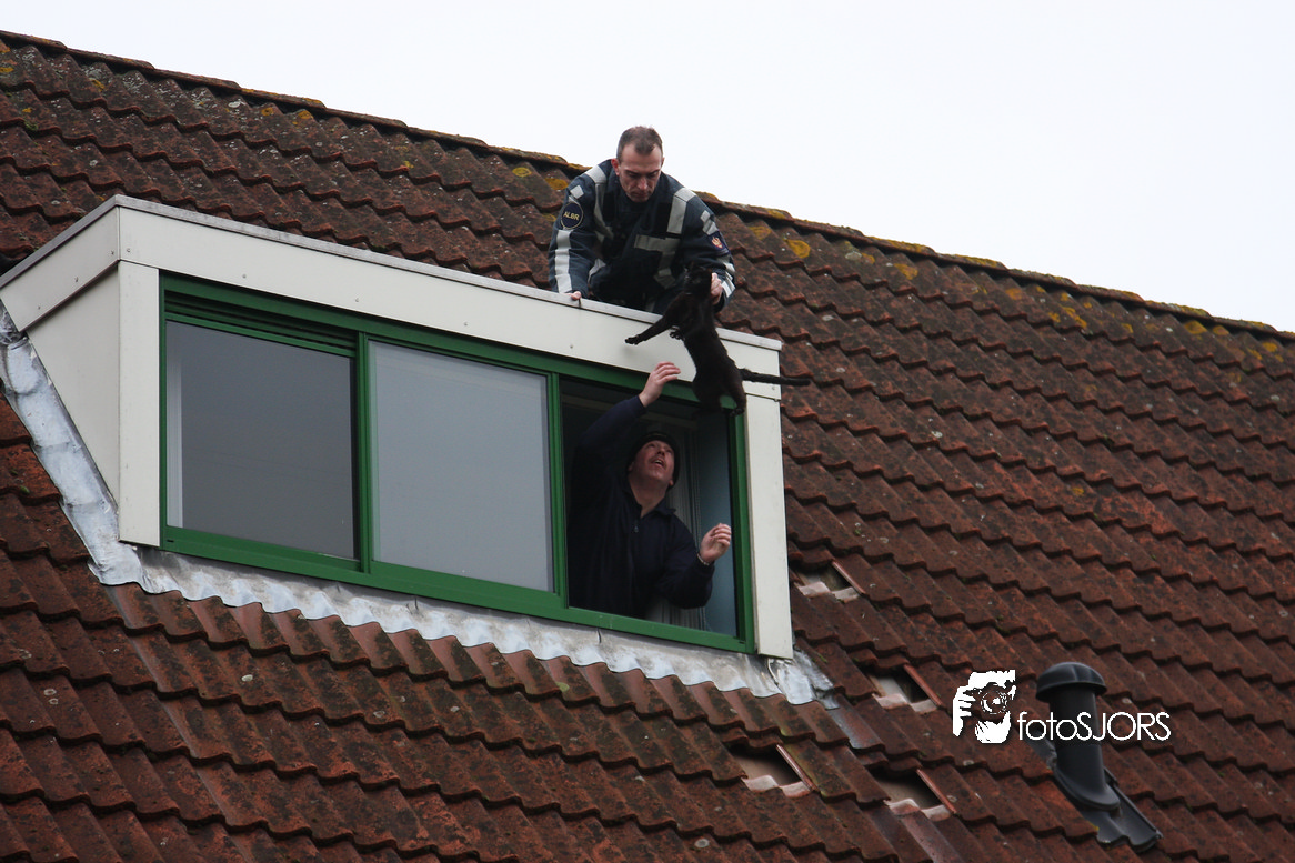 23-01-2010 Brandweer redt 2 poesen van het dak aan het Nachtwaker in Rhoon -