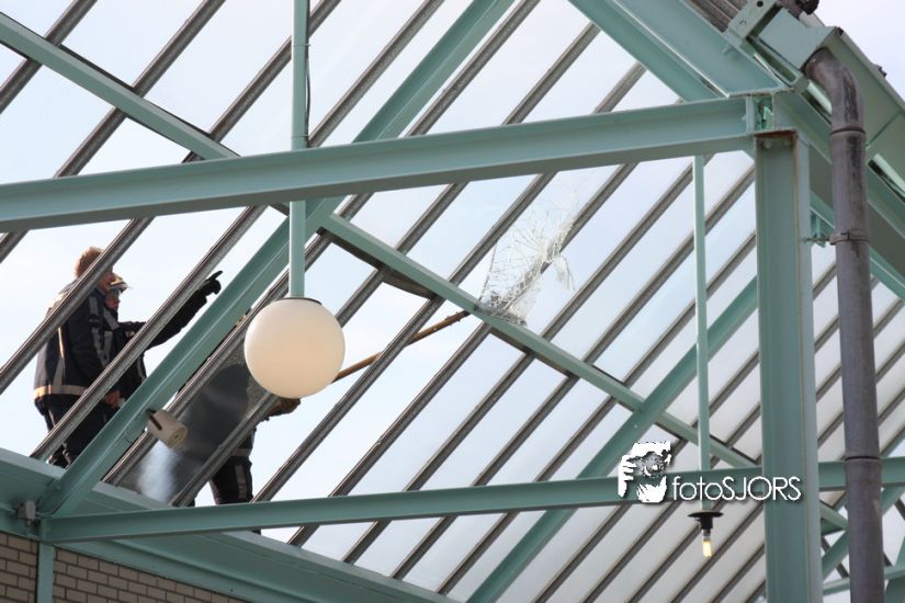 > 14-05-2010 - Brandweer haalt gevaarlijk loshangende glasplaten weg > 281 Images