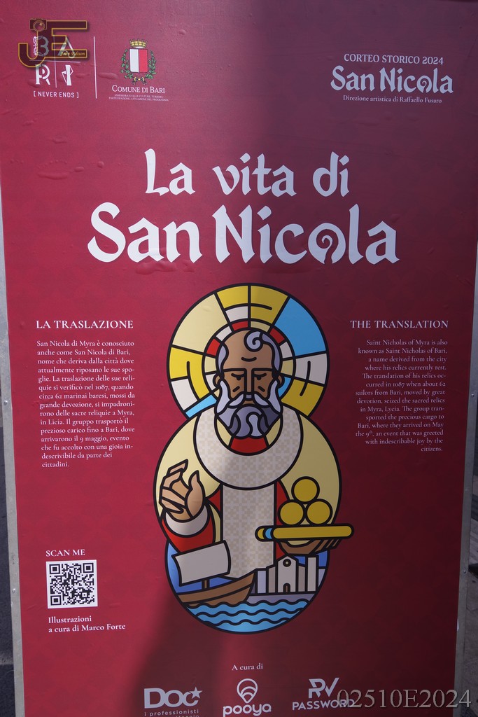08-05-2024 - Sint Nicolaas borden op winkelstraat met levensverhaal Bari
