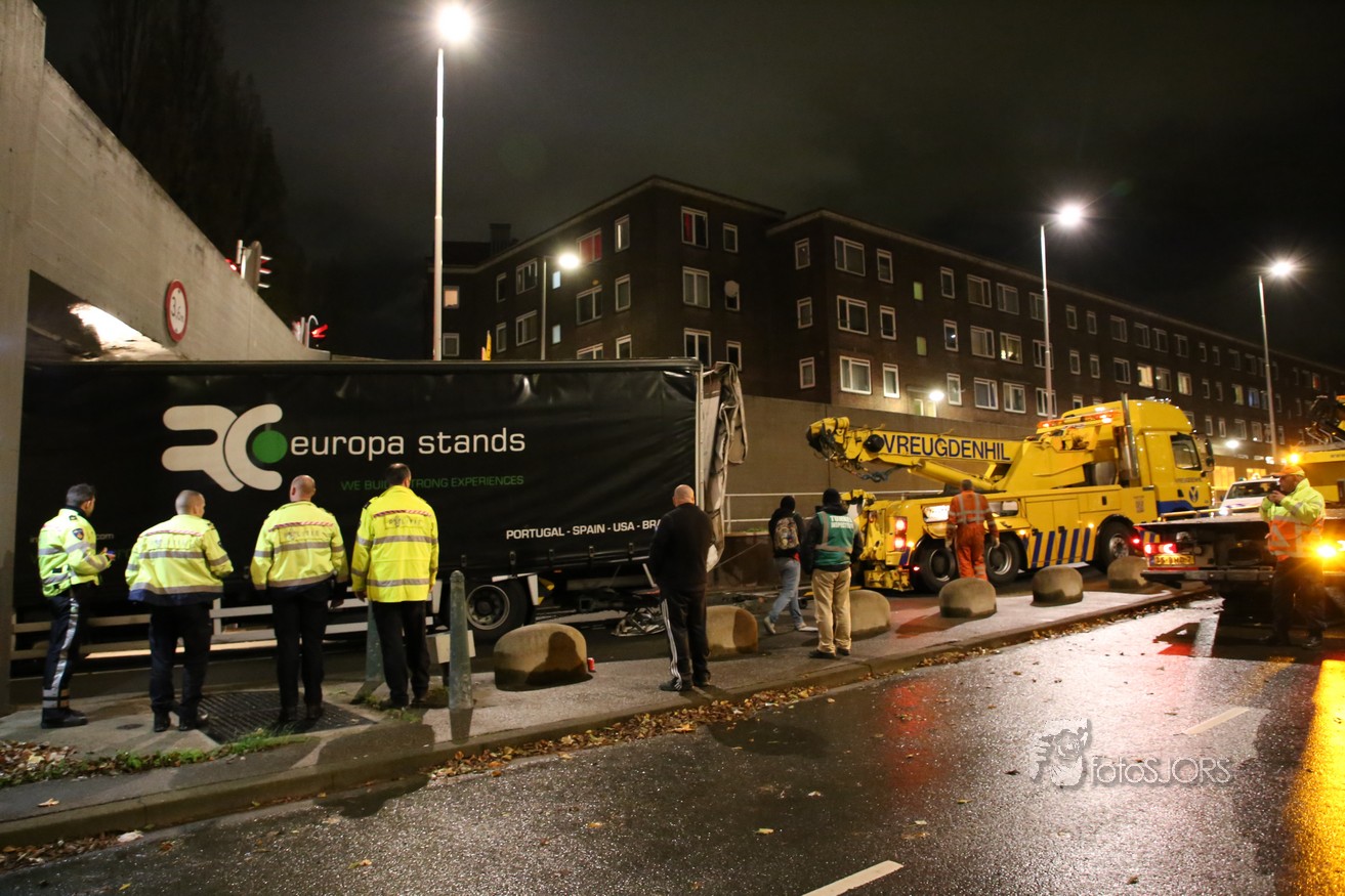 11-11-2017 - Vrachtwagen vast onder viaduct in Rotterdam Pleinweg