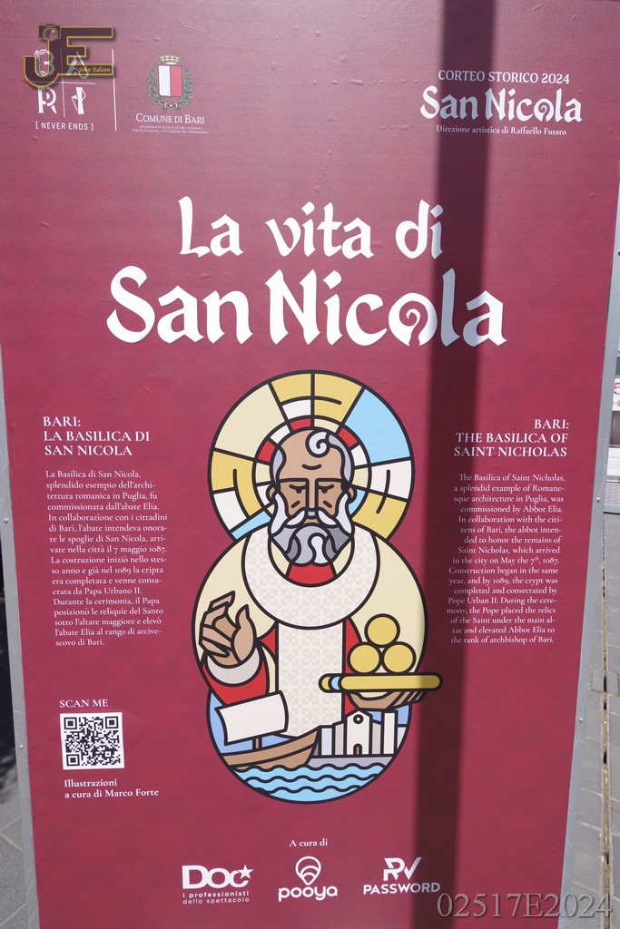 08-05-2024 - Sint Nicolaas borden op winkelstraat met levensverhaal Bari
